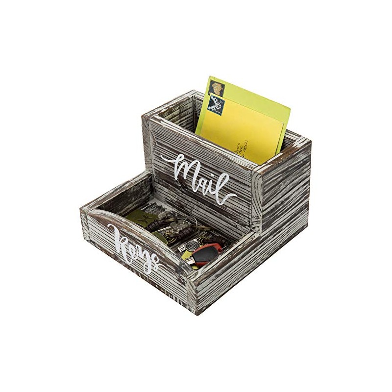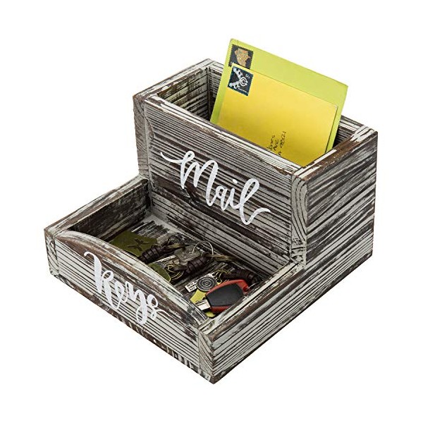- Tabletop wood mail organizer and key holder tray with rustic torched finish and stylish cursive "MAIL" and "KEYS" font labels