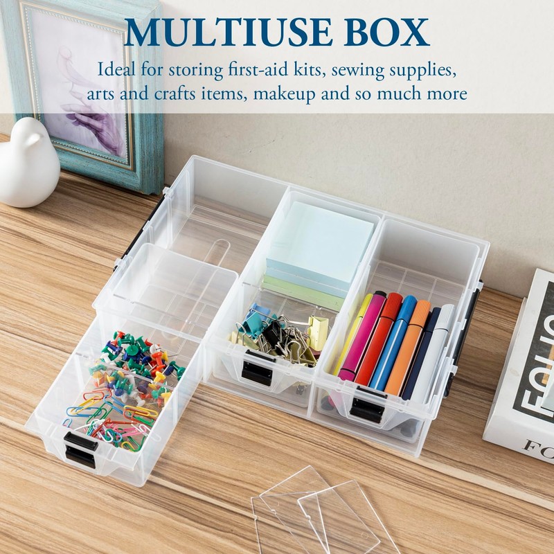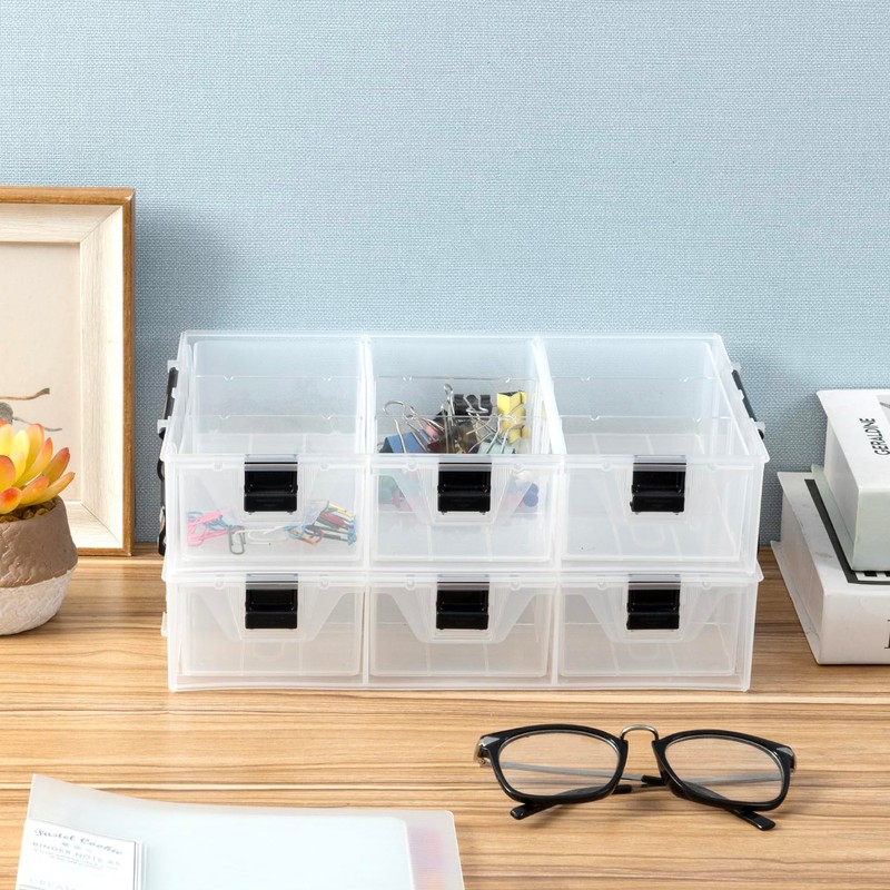 - Premium quality clear plastic empty single tray with black accents, 3 drawers, and 9 customizable compartments for storage expansion **Stackable container sold separately**