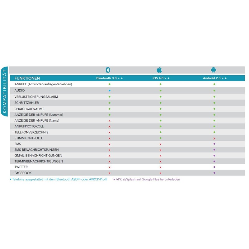 - Features:Call handling, missed calls notification, microphone, listening to music, answering a call, dial numbers, anti-lost alert , pedometer