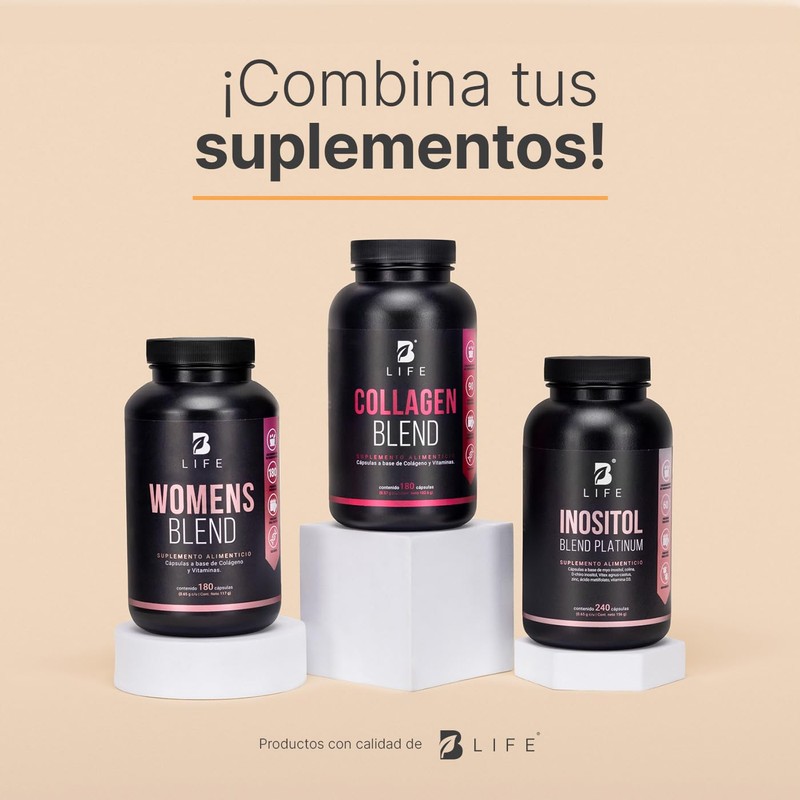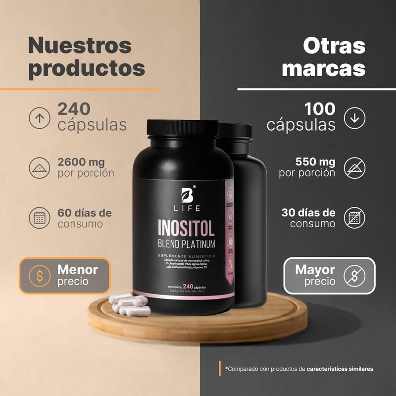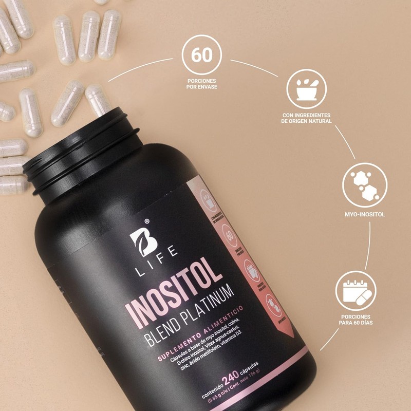 - ¡Inositol Blend Platinum B Life, el equilibrio interno de las mujeres! Cada cápsula de 650 mg contiene una poderosa formulación a base de Myo inositol, Colina, D-chiro inositol, Vitex agnus-castus, Zinc, Ácido metilfolato, y Vitamina D3. Estos ingredientes trabajan juntos para potenciar los beneficios de la composición. Esta valiosa combinación para el bienestar femenino no se encuentra en otras presentaciones.