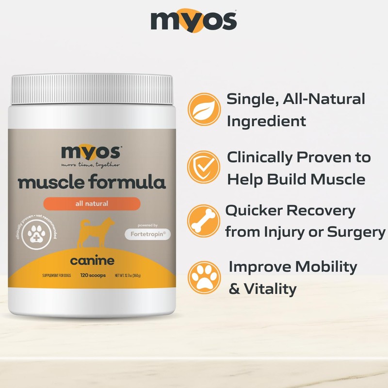 - BUILD MUSCLE MASS: MYOS Canine Muscle Health Formula is clinically proven to prevent muscle loss in all dogs, and is an effective muscle building supplement for puppies, adult dogs, and senior pets looking to enhance muscle growth.