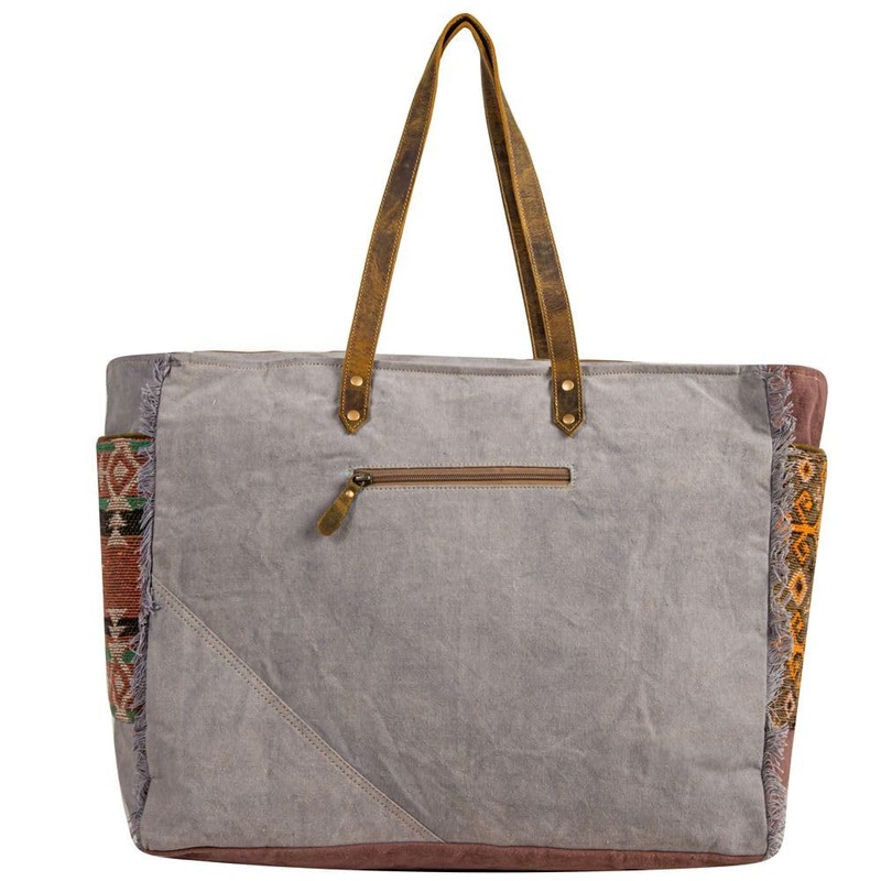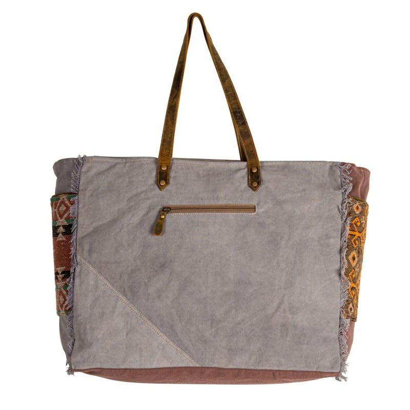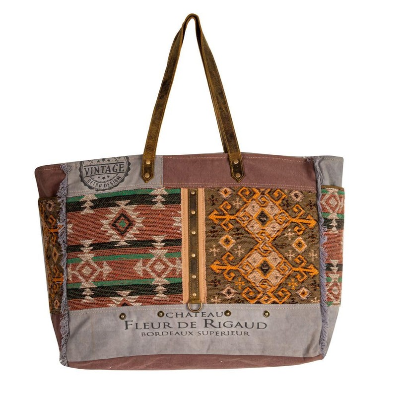 - FASHION WEEKENDER BAG - A delightful blend of Southwest, tribal-inspired, and vintage travel elements all in one! The gorgeous patterns and colors of the woven upcycled rug are the centerpiece.