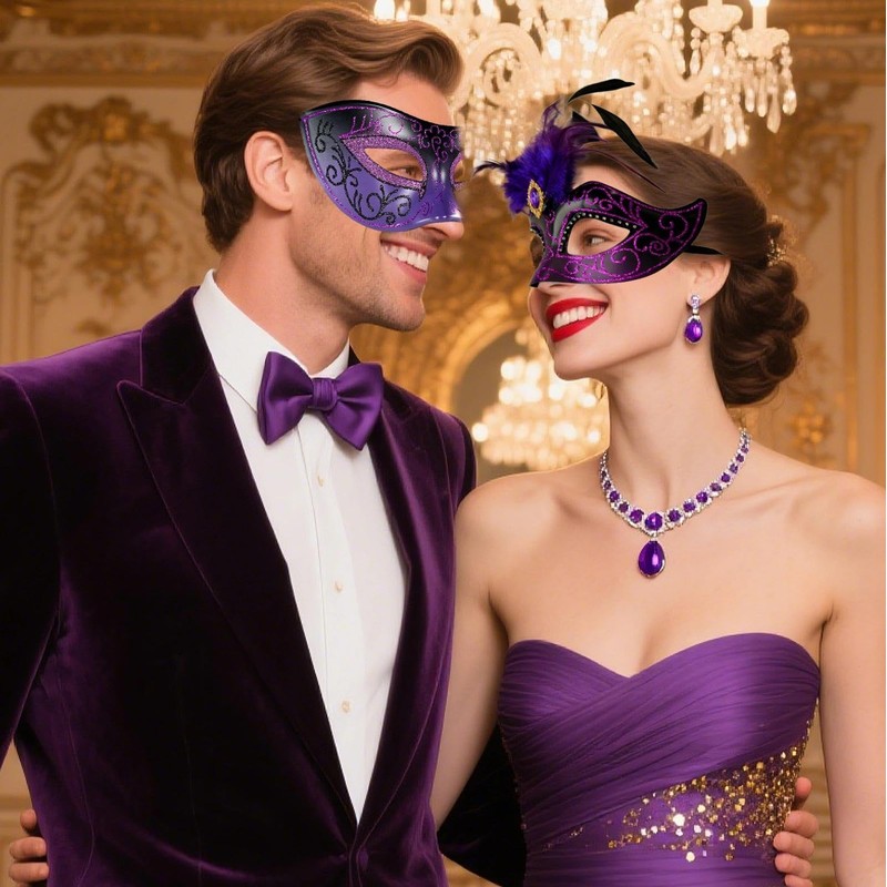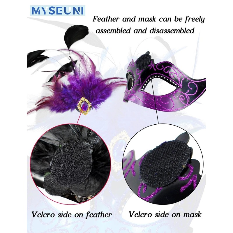 MYSEUNI 2025 Purple Masquerade Mask with Feathers for Couple - Masquerade Masks for Adults - Women Costume Mask for Mardi Gras, Cosplay Party
