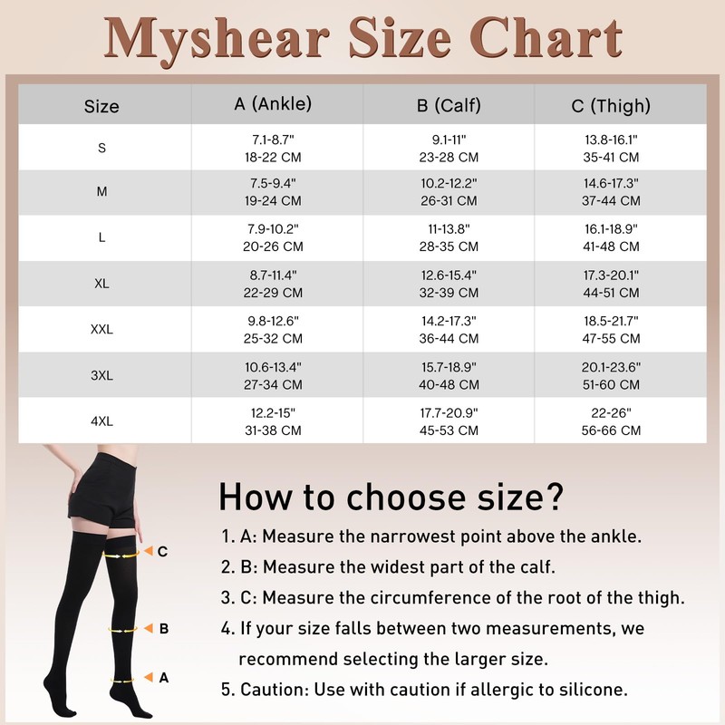 • FASHIONABLE & VERSATILE: Myshear full-length anti embolism stockings blend fashion with functionality. The elegant design makes them a perfect accessory for any outfit, from casual to formal. Whether at home, exercising, or on the go, these stylish support stockings are a must-have for women seeking both comfort & style. If your measurements fall between sizes, we recommend choosing the larger size for optimal comfort and effectiveness. If you have any questions, feel free to contact us anytime