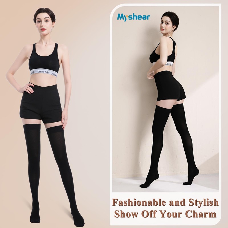 • ULTRA COMFORTABLE SECOND-SKIN FIT: Crafted from a blend of 75% nylon, 20% spandex, and 5% elastic fiber, Myshear thigh high compression stockings provide a soft, luxurious feel against your skin. The opaque fabric ensures discreet coverage, while the high elasticity offers a snug fit that’s easy to wear throughout the day without any bulkiness