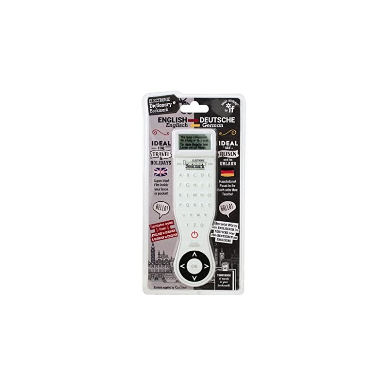 These Collins Dictionary electronic bilingual bookmarks make perfect companions for anyone learning a language or travelling. These bilingual versions feature over 55,000 words in two languages. Simply type in your word in either language for an instant translation. Choose from French, Italian, German or Spanish. All translate to English Available in white Holds 55,000 words in both languages Battery included