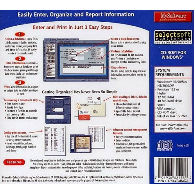 Easily Enter, Organize and Report InformationEnter and Print in Just 3 Easy StepsStep 1Select a database. Choose from 20 databases including contacts, customers, friends, company data and home information. Or easily create a custom database.Step 2Enter information. Import data from most popular databases or let the field names guide you through data entry. Easily sort and remove duplicates.Step 3Print. View information in a report or output data to a label, envelope or card.Getting Organized Has Never Been So SimpleFeatures:Formatted reports with every templateReport customization including report titles, subtotals, headers and footers, recordsPrints customer and product listsPersonalized emailCustomizing a database is easy. Type in field name Specify field type Calculate a formula on numeric and currency fields Click the OK button and arrangePrint envelopes, labels, Rolodex cards & more. Choose from hundreds of different output options Specify the fields to print Personalize by adding your ownAdvanced contact management features. Track your communications Enter reminder Send up to 1,000 personalized emails per hour to names within your contact list.Quickly print reports. Use one of the formatted reports or easily create your own Insert report titles, column, headings, totals, page numbers and datesPre-designed templates for both business and personal use10,000 clipart images and 100 fontsNotes table for history and to-do itemsSort, filter and indexCalculation & totalingWindows XP, Vista, 7, 8 compatible