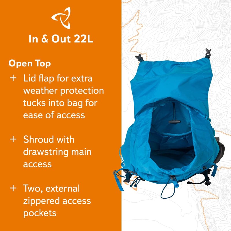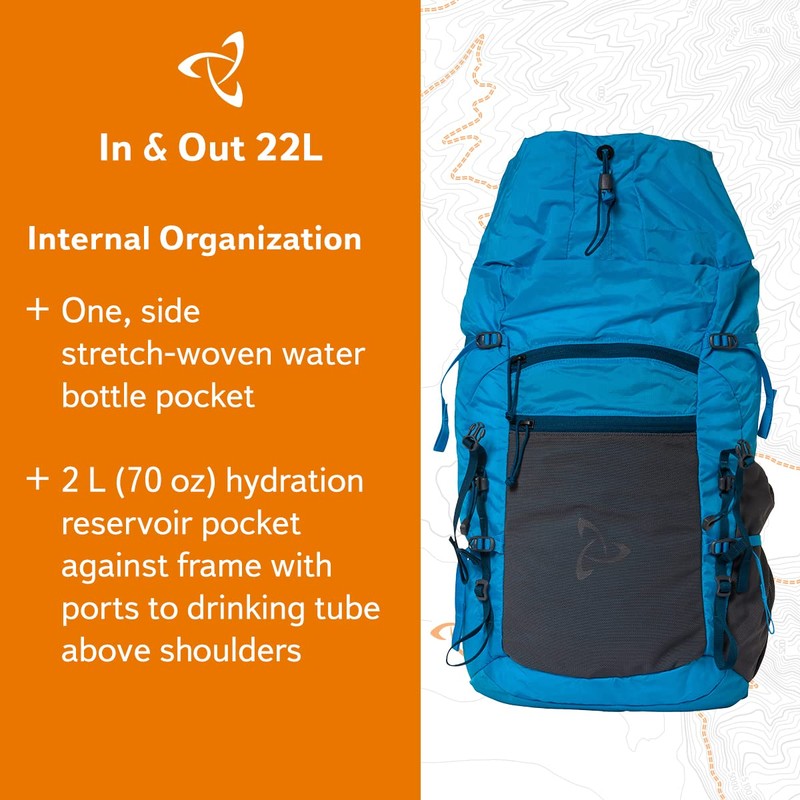 - 6 L (70 oz) hydration reservior pocket against frame with ports to drinking tube above shoulders