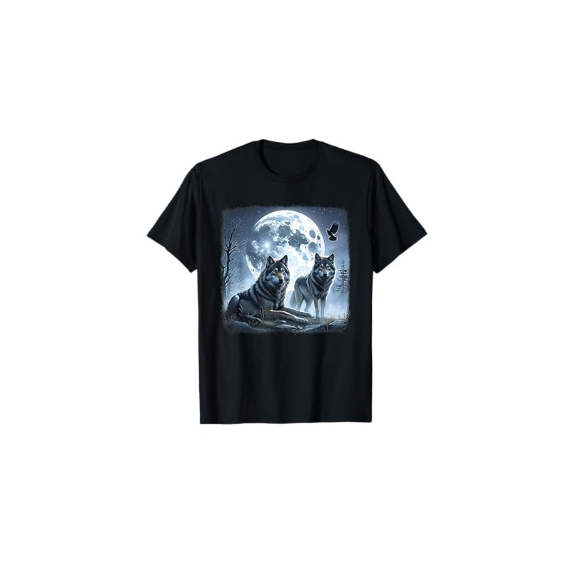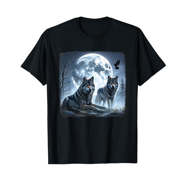 - This captivating design features two beautifully rendered wolves standing guard under a luminous full moon, surrounded by bare tree branches and a misty night sky.