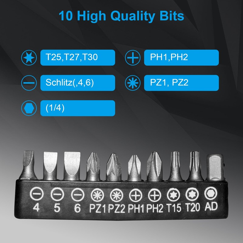 - Specification: The package includes 1 mini ratchet wrench and 10 screwdriver bits. The dimensions are 112 mm long and 18 mm wide, the hex bit measures 1/4 inch and the wrench has 36 ratchets. Screwdriver head model: PH1, PH2, PZ1, PZ2, 4, 6, T25, T27, T30, 1/4.