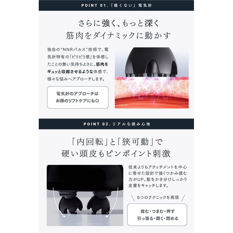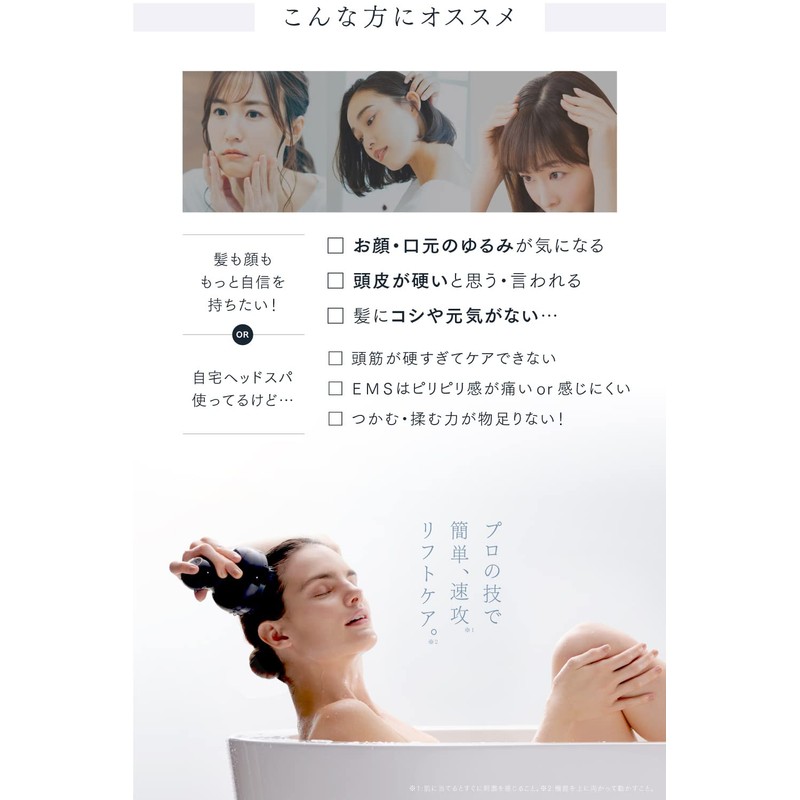 - for FACE: 気になるおでこ、口元、 フェイスライン を リフトケア / for BODY: 全身に心地よい 揉み + EMS で 筋肉 を効率的に刺激 / for SCALP: サロン級のもみ心地で、すっきり柔軟な 頭皮 へ