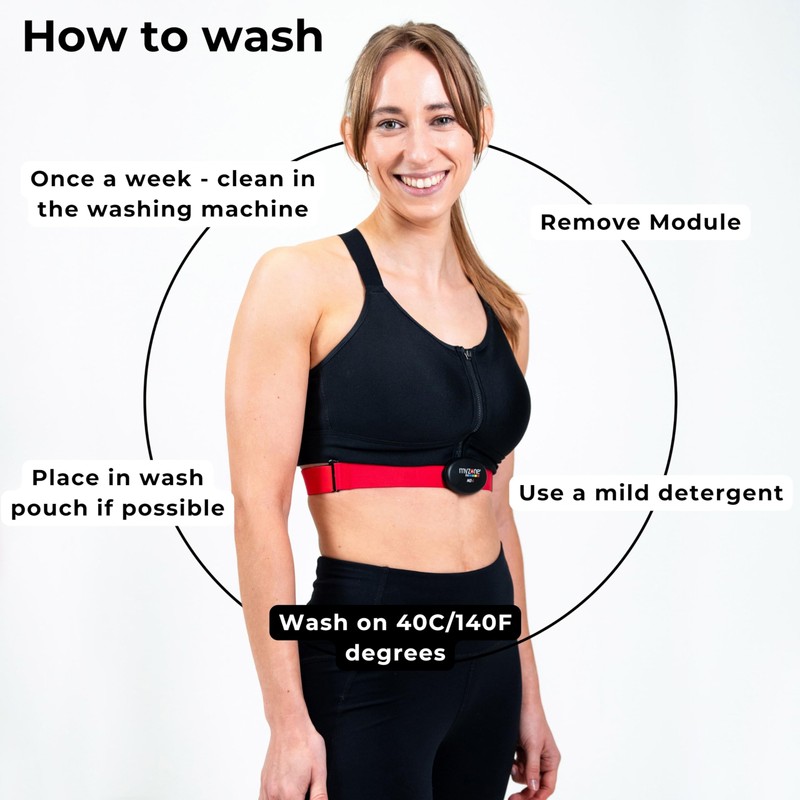 • To get the most out of your Myzone strap, rinse with water after every use, and put in the washing machine every 5 uses on a gentle cycle at 40°C/104°F.