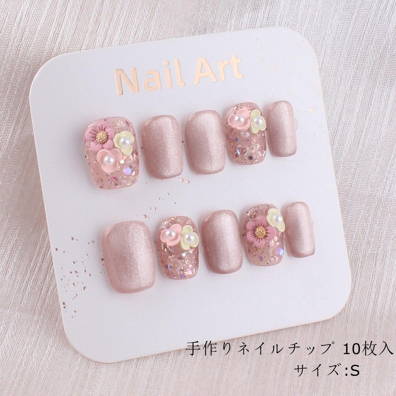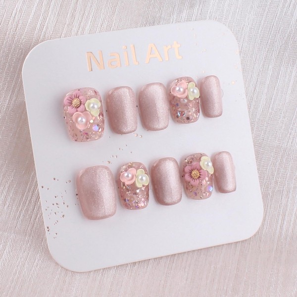 MZCMSL Handmade Nail Tip, Short, Square, Pink, Flowers, Flower Pattern, Pearl, False Claws, 3D, Short Nails, Small Nails, Popular, Finger Suit, Pack of 10, Cat Eye, Magnetic False Nails, S