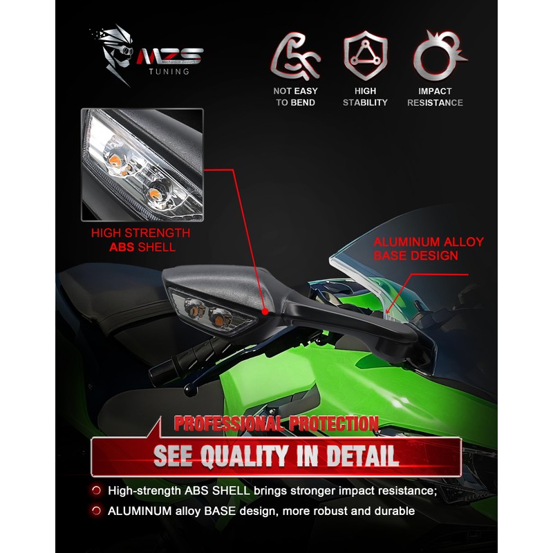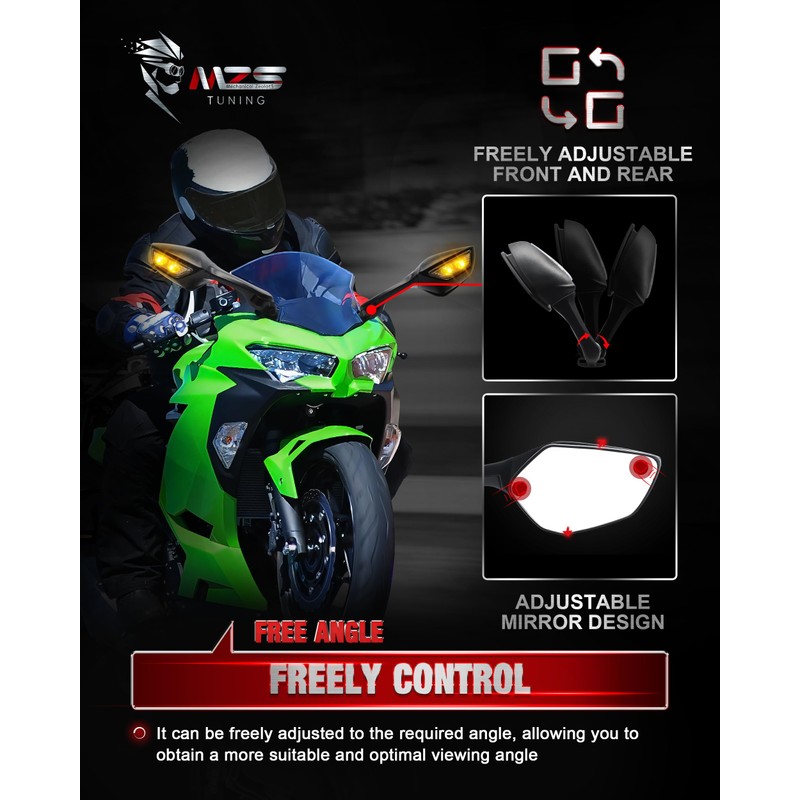 MZS Motorcycle Mirrors With Turn Signals, Racing Rearview Side Mirror LED Light Sport Bike Adjustable Compatible with ZX6R ZX10R ZX25R CBR600RR CBR650R FZ6R