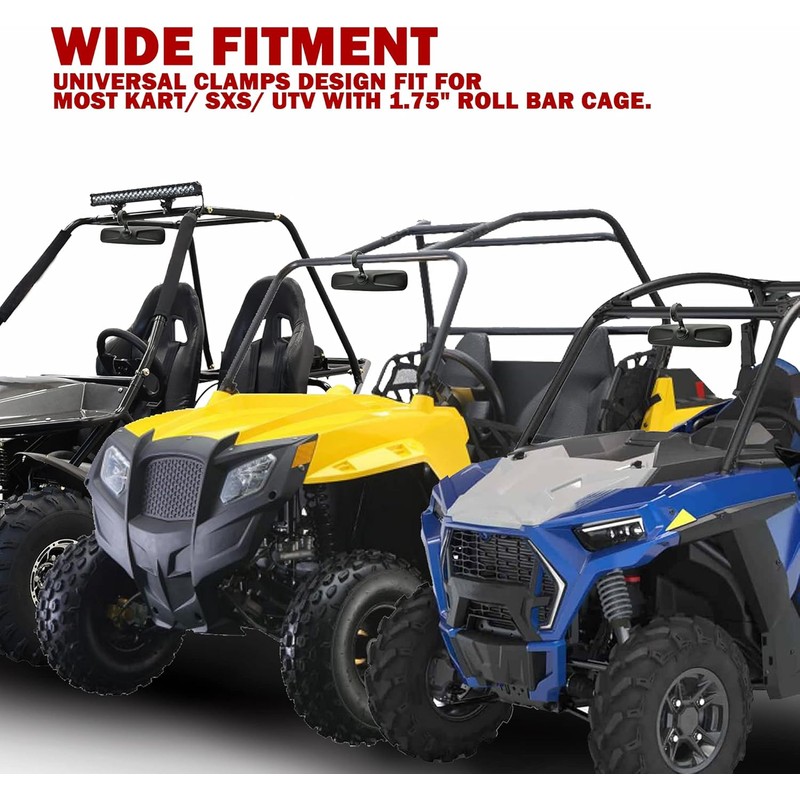 WIDE FITMENT - Universal fit for Kart/ SXS/ UTV rear view mirror or side view mirror with 1.75" roll bar cage. Please check "vehicle fitment list" or the roll bar size, make sure that this model type and size work for your bike before ordering