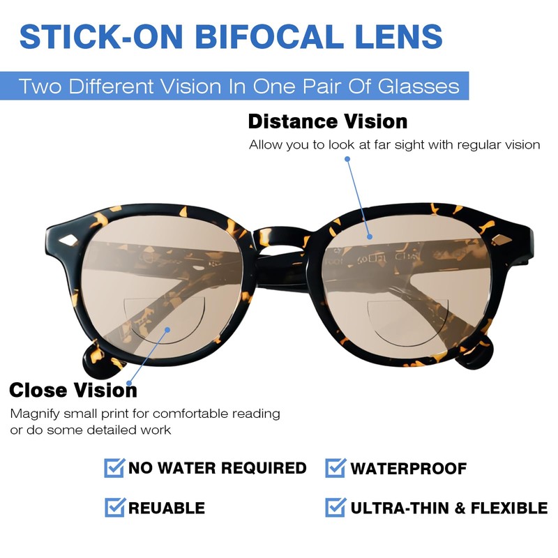 - 【Reuable Stick-On Bifocal Lens】Press the lens directly on your glasses without any water. No matter how many times you reposition or peel off the bifocal lenses, we promise they still stick firmly to your glasses.