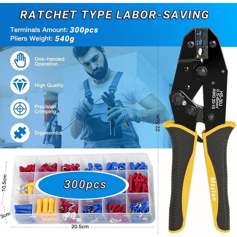 Mzylan Ratcheting Crimping Tool with 300 CPS Insulated Terminals - Wire Crimper Pliers for Secure Connections | Ergonomic Handle & Heavy-Duty Copper Alloy | 22-10 AWG Electrical Crimper