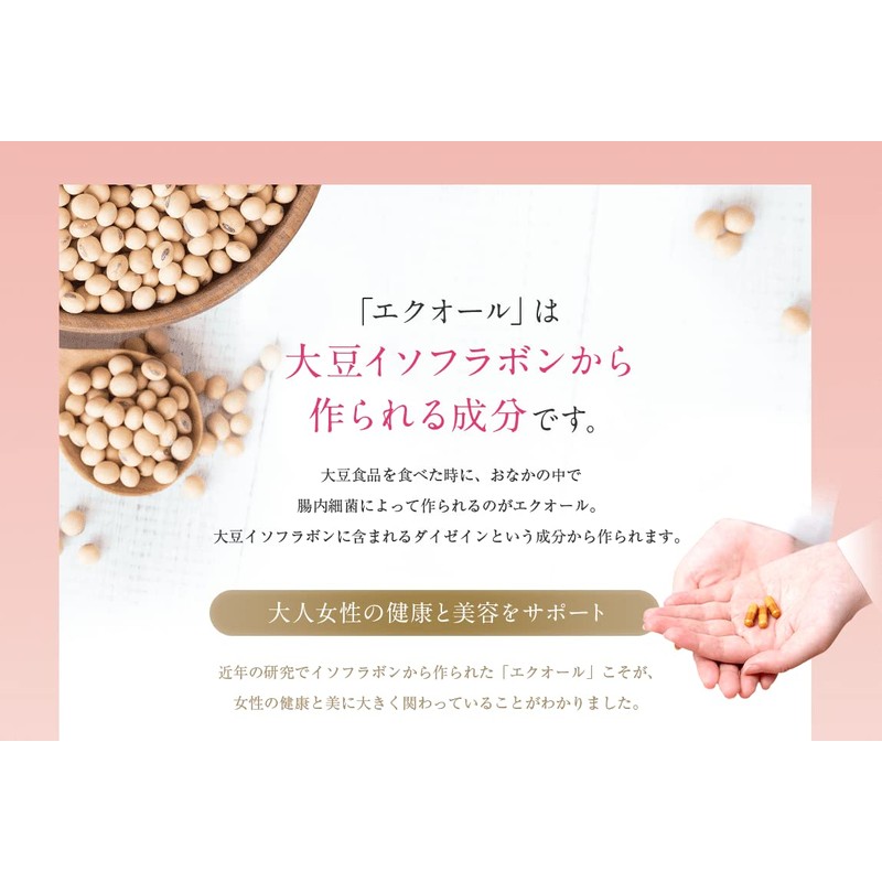 - エクオールは大豆イソフラボンから作られる成分です。近年の研究でイソフラボンから作られた「エクオール」こそが女性の健康と美に大きく関わっていることがわかりました。