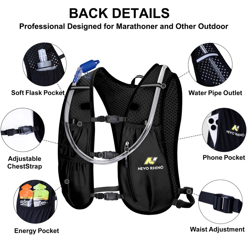 - Security and Multiple Storages:Reflective N NEVO RHINO logo for nighttime safety and the Survival whistle in front pocket for emergency.There are also two soft flask pockets(soft flask not included),a zipper pocket and a small pocket.You can put gel soft candy,paper,towel,mobile phone,key in the front pocket