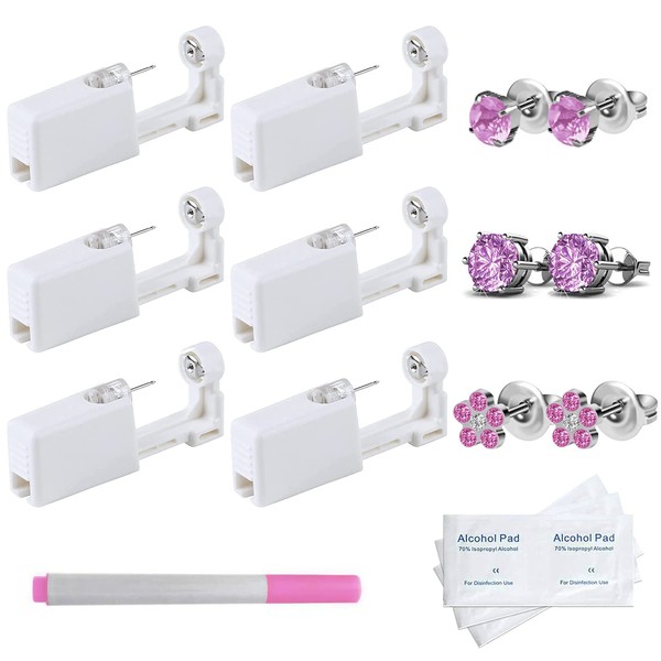 - 【Package Contents】You will receive 6 pack self ear piercing gun with rose pink earrings stubs built in the piecing gun, and 6 pieces alcohol pads.In addition, we also provide you with one marker pen ,you can use it to pierce precisely where you want,thereby reducing the possibility of piercing the wrong location.