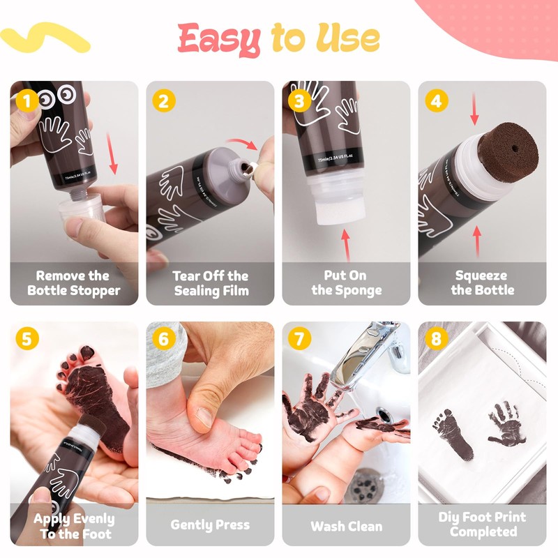 - 【LARGE CAPACITY】Each tube of our baby handprints and footprints safety Ink has a capacity of 2.54 fl.oz (75ml, Brown), capacity for multiple uses, and easy to carry and store. You can easily print your baby's cute little footprints on any card or baby book. Capture the beautiful moments and when the baby grows up, the baby footprints will become a masterpiece of great commemorative value.