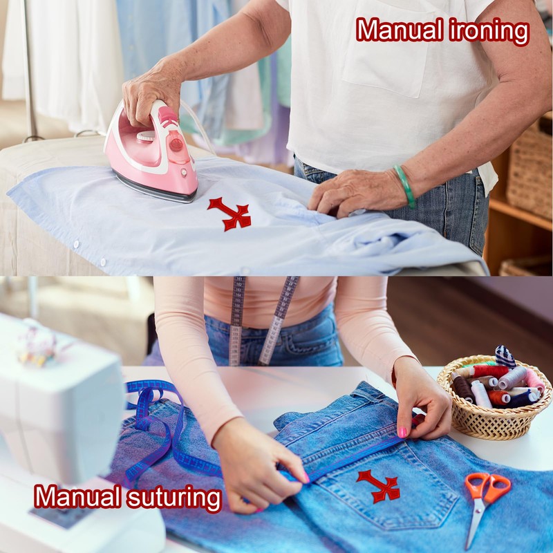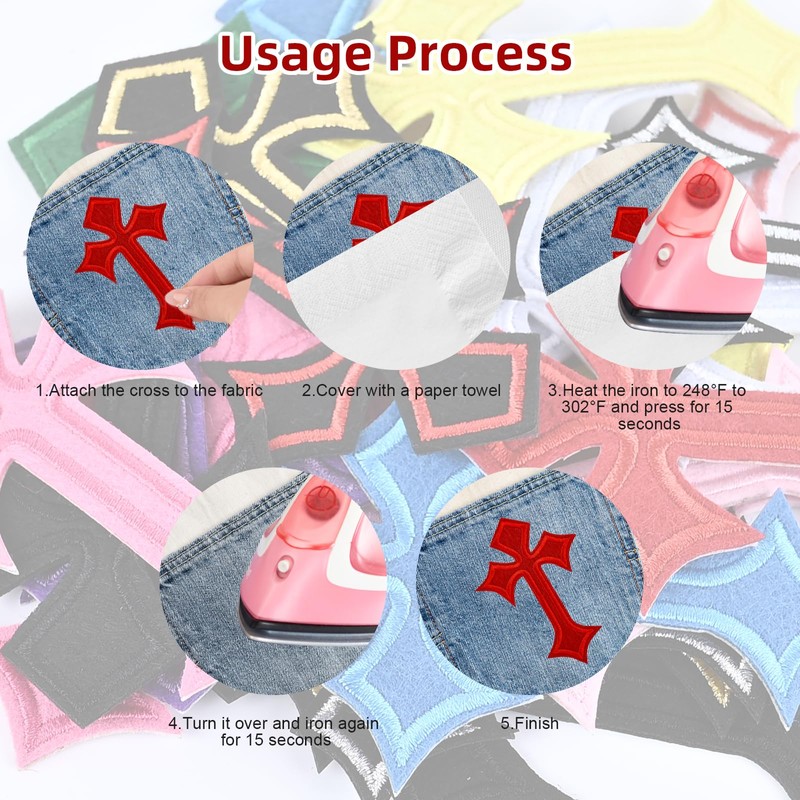 - How to Use: stick the reverse side of the cross patch on the clothes, cover it with thin cotton cloth, and heat it with an iron. Adjust the temperature to below 150℃ and control the time within 15 seconds. Then turn it over and repeat the steps. Wait for it to cool down.