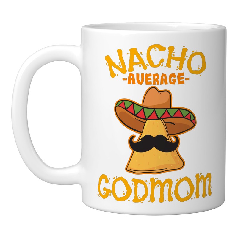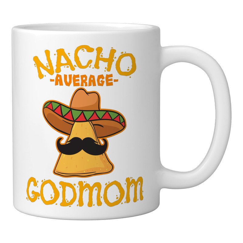 - Nacho Average Godmom - This design shows melted cheese sauce and tortilla chip with mustache and Mexican sombrero hat. Perfect for godmothers, godmamas, godmas, or godmoms of a godchild, goddaughter, or godson. Great idea for nacho lovers.
