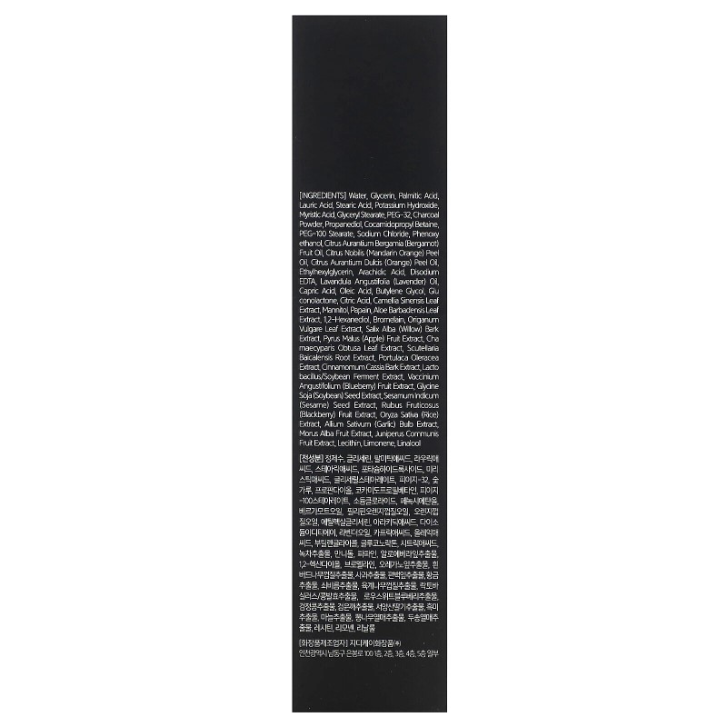 Water, glycerin, palmitic acid, lauric acid, stearic acid, potassium hydroxide, myristic acid, glyceryl stearate, peg-32, charcoal powder, propanediol, cocamidopropyl betaine, peg-100 stearate, sodium chloride, phenoxyethanol, citrus aurantium bergamia (bergamot) fruit oil, citrus nobilis (mandarin orange) peel oil, citrus aurantium dulcis (orange) peel oil, ethylhexylglycerin, arachidic acid, disodium edta, lavandula angustifolia (lavender) oil, capric acid, oleic acid, butylene glycol, gluconolactone, citric acid, camellia sinensis leaf extract, mannitol, papain, aloe barbadensis leaf extract, 12-hexanediol, bromelain, origanum vulgare leaf extract, salix alba (willow) bark extract, pyrus malus (apple) fruit extract, chamaecyparis obtusa leaf extract, scutellaria baicalensis root extract, portulaca oleracea extract, cinnamomum cassia bark extract, lactobacillus/soybean ferment extract, vaccinium angustifolium (blueberry) fruit extract, glycine soja (soybean) seed extract, sesamum indicum (sesame) seed extract, rubus fruticosus (blackberry) fruit extract, oryza sativa (rice) extract, allium sativum (garlic) bulb extract, morus alba fruit extract, juniperus communist fruit extract, lecithin, limonene, linalool.