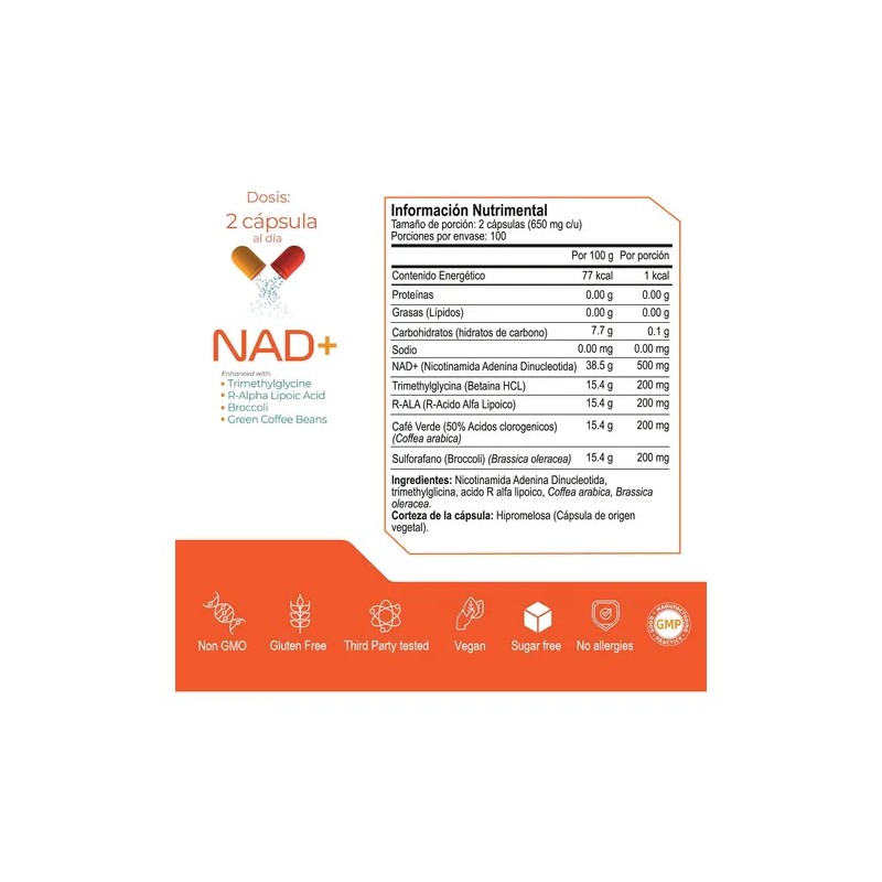 NAD+ con Nicotinamida Adenina Dinucleótido (NAD), Trimetilglicina (TMG), Ácido R-alfa Lipoico y extracto de Café Verde. Esta combinación está orientada hacia la mejora de la función mitocondrial y el soporte del ciclo de la metilación.
