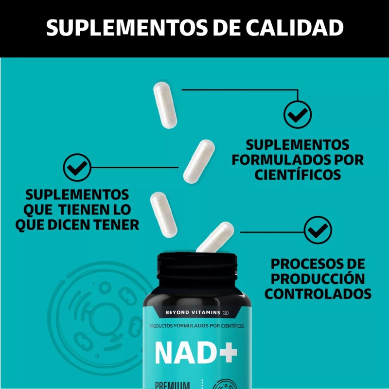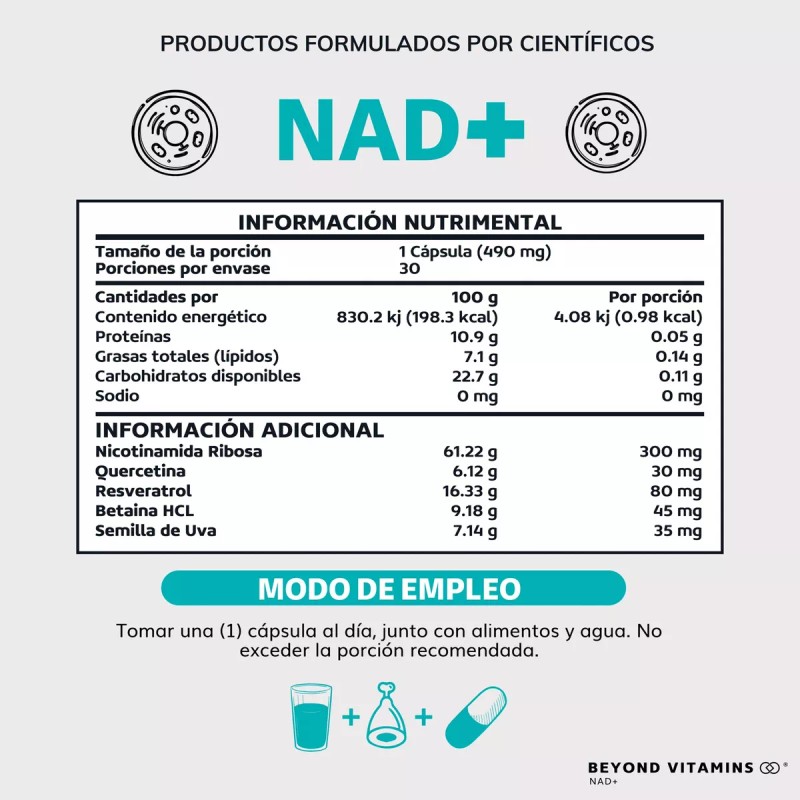NAD+ Beyond Vitamins contiene una combinación completa Nicotinamida Ribosa, Quercetina, Resveratrol, Beatina HCL y Semilla de Uva. Nuestro producto son el resultado de investigación y estrictos estándares de control de calidad. Es ideal para hombres, mujeres y personas mayores. Nuestro NAD+ es libre de lácteos, soya, hormonas, antibióticos, conservantes, azúcar, colorantes y sabores artificiales. Es VEGANO.