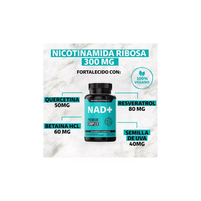 Activa tu energía celular con el suplemento premium NAD+ | NR (Nicotinamida Ribosa) de última generación ⚡💊. Su fórmula avanzada está potenciada con resveratrol, quercetina, betaína HCl y extracto de semilla de uva, creando una sinergia poderosa para apoyar el metabolismo, la regeneración celular y el envejecimiento saludable 🧬⏳.