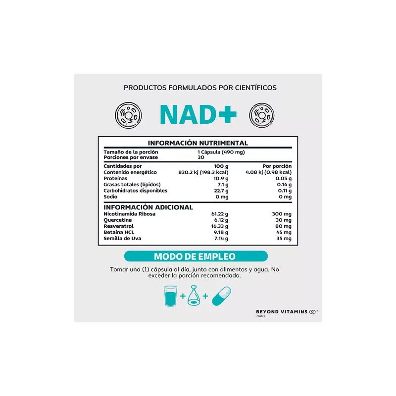 Nad+ | Nr Nicotinamida Ribosa - Suplemento Alimenticio Premium Potenciado Con Resveratrol, Quercetina, Betaina Hcl Y Semilla De Uva | Sin Sabor - 30 Cápsulas