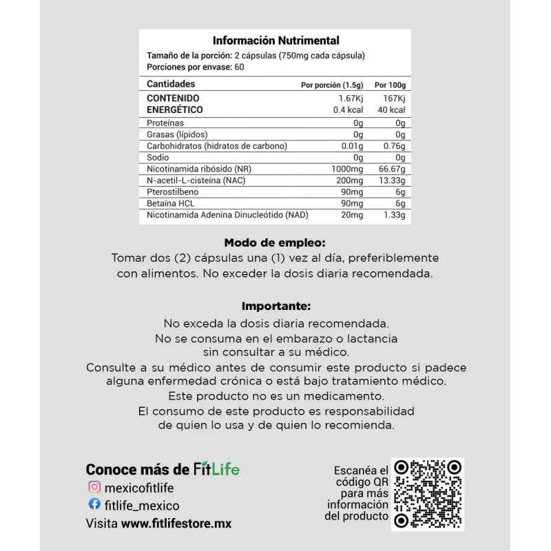 Este suplemento combina dos potentes activos: NAD+ (Nicotinamida Adenina Dinucleótido) y Resveratrol, reconocidos por su impacto en la energía mitocondrial, la longevidad celular y el envejecimiento saludable.
