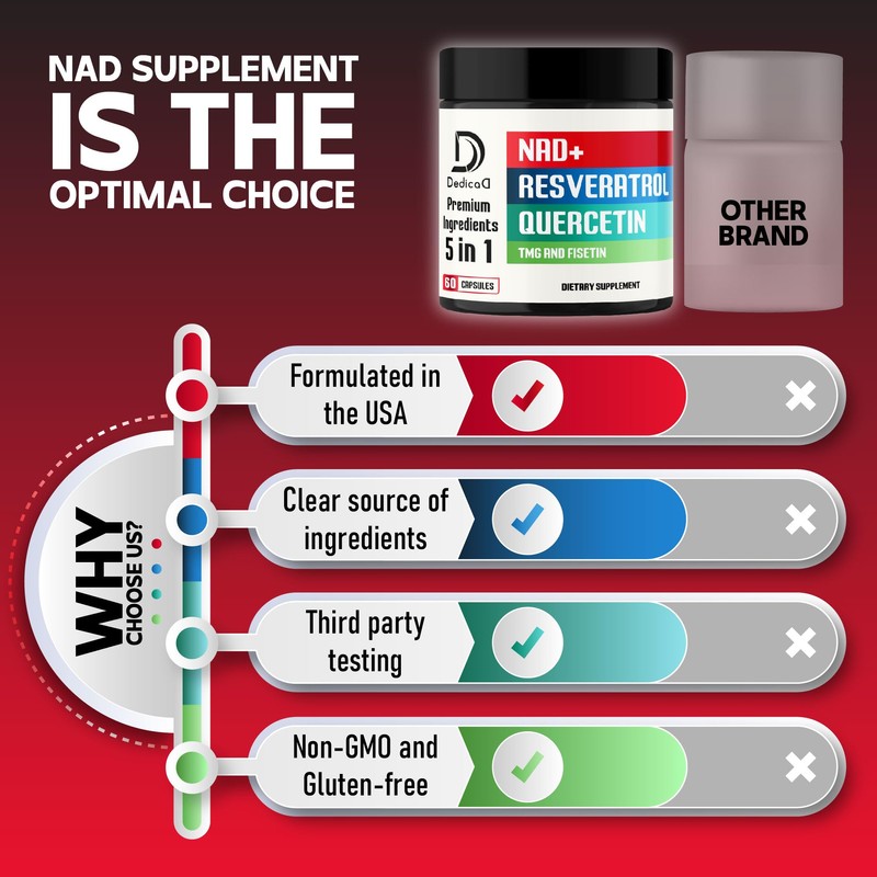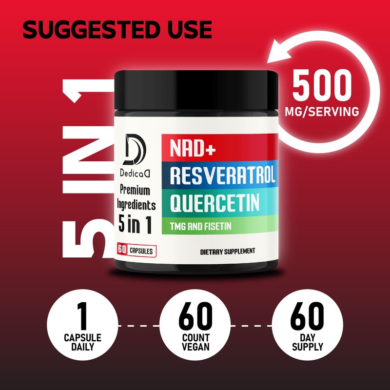 DEDICAD NAD+ Supplement 500mg - Pure NAD Supplement - Combined to Fisetin, TMG, Resveratrol and Quercetin - Energy and DNA Repair, Aging Defense, Brain Function - 60 Capsules