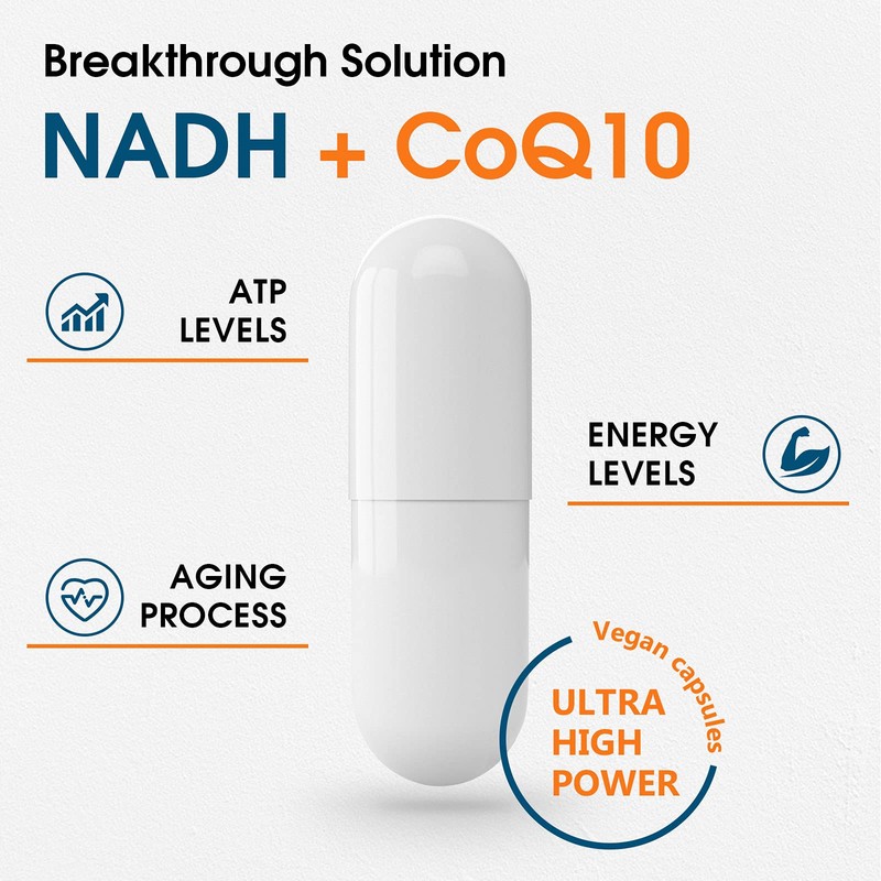 - 50mg Reduced NADH, 200mg Ubiquinol CoQ10, and 150mg D.