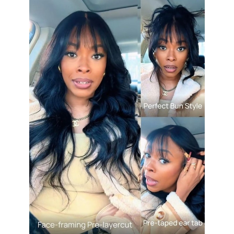 - ✅【Beautiful Package & Return policy】:7x5 Pre Everything Glueless Bye Bye Knots Loose Wave Lace Closure Drawstring Wig with Bangs +HD Wig Cap + Eyebrow brush +10 Pairs Ear Tape ,Can be return and exchange as long as the wig is new or just get it in two Weeks.
