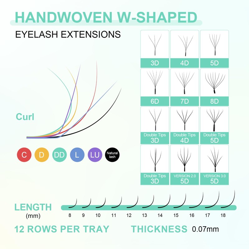 - Easy to use: The pre-made W-shaped fan eyelashes are made in advance, so you don't have to spend time making fans. Simply clamp the middle part of the eyelashes and lift it towards your right hand. You get W-shaped eyelashes and create 3D fans with natural fluff in one second. 1 eyelash tray can be used for 10-15 customers.