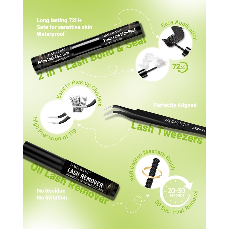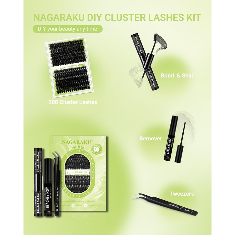 - Professional Eyelashes Extension: As a professional eyelash designer brand, we are committed to providing chic products, aimed at adding more glamour to our customers. NAGARAKU provides everything you need for DIY lash extensions, including clusters, lash tweezers, lash bond and seal, lash glue and removers. Come try a new way of DIY eyelashes with us that brings you salon quality while saving you time and money