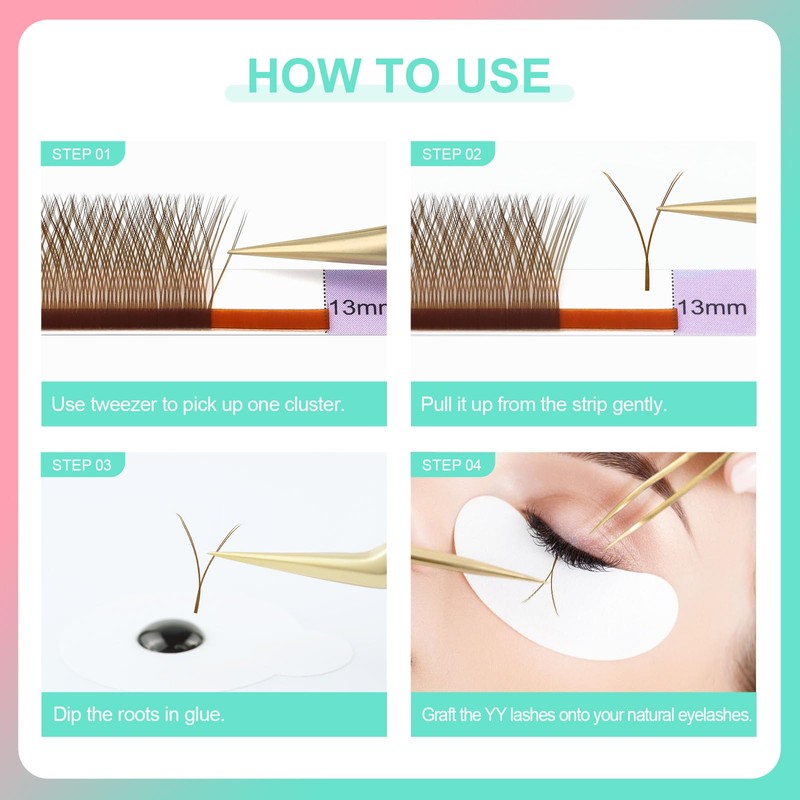 - YY LASH: This Y-shape eyelash has 4 extensions bonded together which is very simple to create fans when grabbing with tweezers, no any skills needed. Get a 4D cluster instantly.