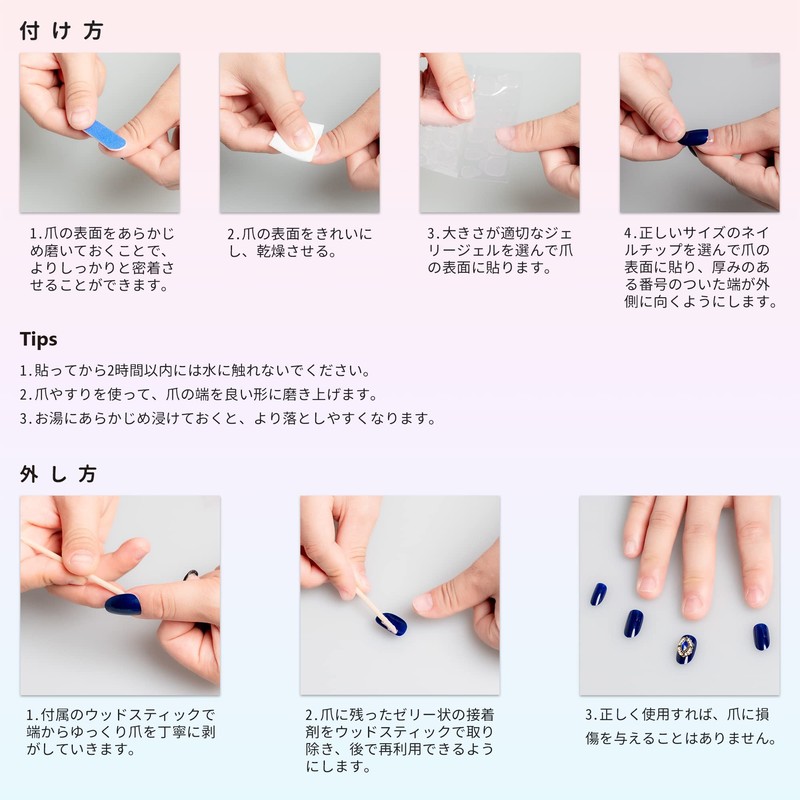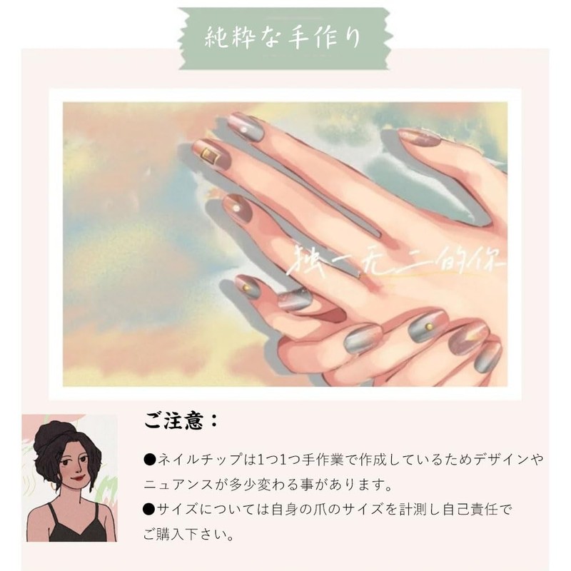 - Note: For flat nails, please heat the nail tip with a hair dryer and press it slightly flat, so please stick it. Alternatively, please paste the double layer of double-sided tape before attaching the nail tip. ● The design and nuances may vary slightly due to manual manufacturing process. ● Colors may appear slightly different depending on your browser or device. This product is assumed to be removed. We are not responsible for any accidents, damage or defects of the product caused by unattached conditions. Nail tips may be damaged if excessive impact or folded. Please measure your nail size and purchase at your own risk. The curve of the chip may vary slightly. Some nails may not fit well with the curve of the tip and may not fit. In that case, we recommend wearing it with a thick layer of adhesive gummies