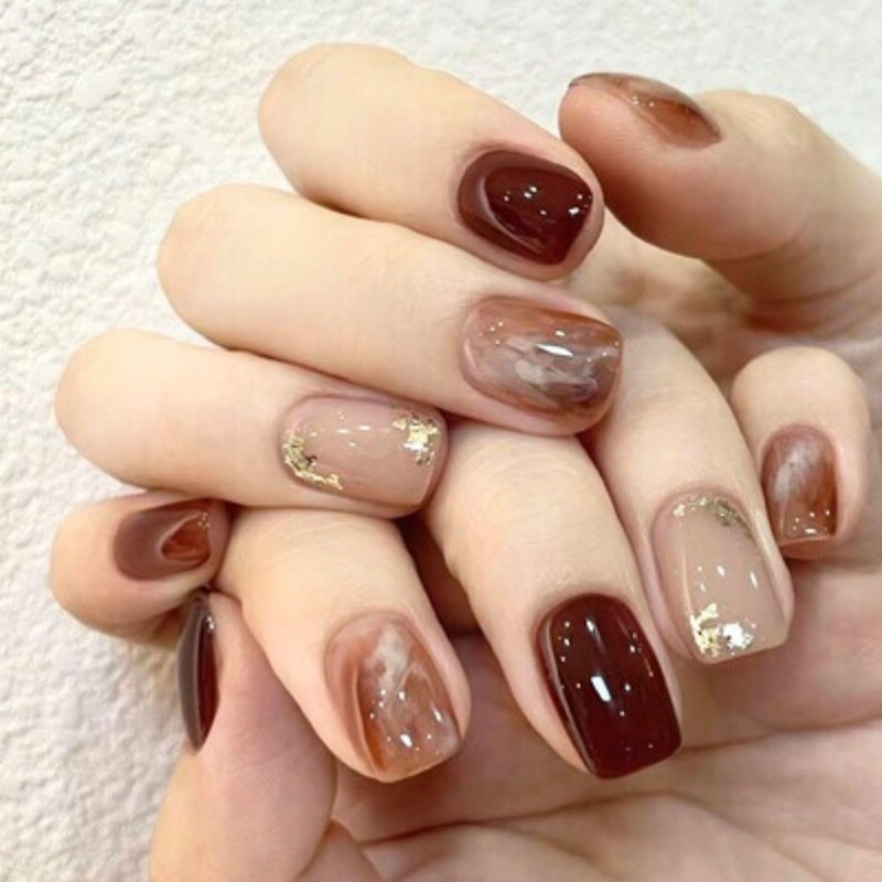 Nail Tips, Set of 24 False Nails, Mocha Color, Gold Flake, Chic Glossy, Nails, Finger Parts, Double Sided Tape, 48 Sticks, File, Alcohol Pad Included, Mocha Brown