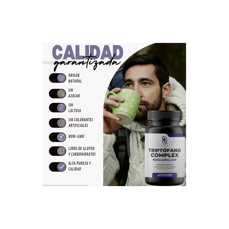 Acerca de este artículo Mezcla de L-Triptófano potenciado con GABA, L-Teanina, Toronjil, Glicinato de Magnesio y 5 HTP, para maximizar los beneficios. Dosis Eficaz: Cada cápsula contiene 500 mg de nutrientes esenciales, con una concentración óptima para su consumo diario. Calidad del Sueño: La importancia de la calidad del sueño, para un descanso profundo y reparador. Energía y Motivación: Un aminoácido clave para la producción de neurotransmisores en los niveles de energía. Apoya el buen estado de ánimo y la motivación. Suplemento ideal para una vida activa. 100% Natural: Este suplemento está elaborado con ingredientes naturales y sin aditivos, ofreciendo una fórmula pura y de alta calidad.
