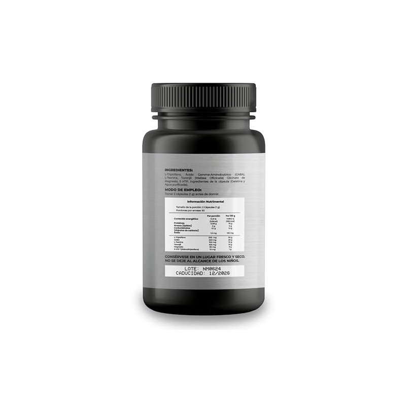 • Teanina, Toronjil, Glicinato de Magnesio y 5 HTP, para maximizar los beneficios. Dosis Eficaz: Cada cápsula contiene 500 mg de nutrientes esenciales, con una concentración óptima para su consumo diario. Calidad del Sueño: La importancia de la calidad del sueño, para un descanso profundo y reparador. Energía y Motivación: Un aminoácido clave para la producción de neurotransmisores en los niveles de energía. Apoya el buen estado de ánimo y la motivación. Suplemento ideal para una vida activa. 100% Natural: Este suplemento está elaborado con ingredientes naturales y sin aditivos, ofreciendo una fórmula pura y de alta calidad.