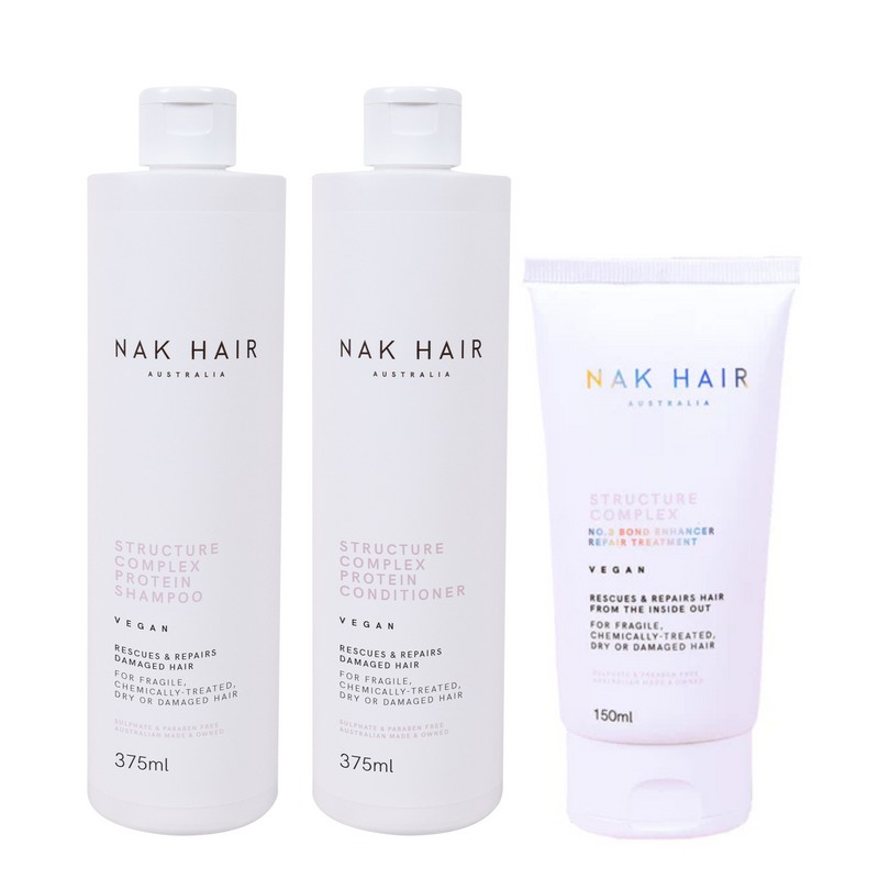 The Nak Structure Complex Trio Bundle is a comprehensive hair care solution designed to strengthen and enhance your hair's natural beauty. This trio bundle from Nak Hair includes a carefully curated selection of products that work together to repair, protect, and nourish your hair. The Structure Complex Protein Shampoo and Conditioner are formulated to infuse your hair with essential proteins, promoting strength and resilience. The Structure Complex No.3 - Bond Enhancer is a specialized treatment that targets and repairs damaged hair bonds, leaving your hair healthier and more manageable. What is included in Nak Structure Complex Trio Bundle? Structure Complex Protein Shampoo 375ml Structure Complex Protein Conditioner 375ml Structure Complex No.3 - Bond Enhancer 150ml Who is Nak Structure Complex Trio Bundle for? The Nak Structure Complex Trio Bundle is perfect for anyone looking to repair and strengthen their hair, especially those with damaged or chemically treated hair.