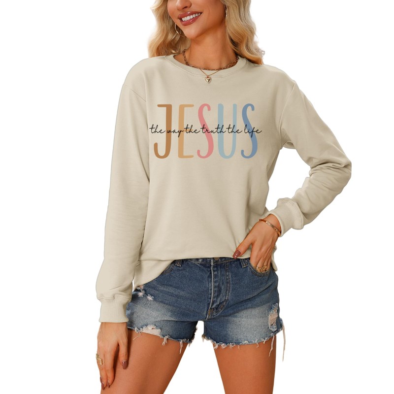 NAKAEOE Christian Sweatshirt Women Jesus the Way the Truth and the Life Long Sleeve Pullover Religious Faith Top (US, Alpha, Large, Regular, Regular, Beige)