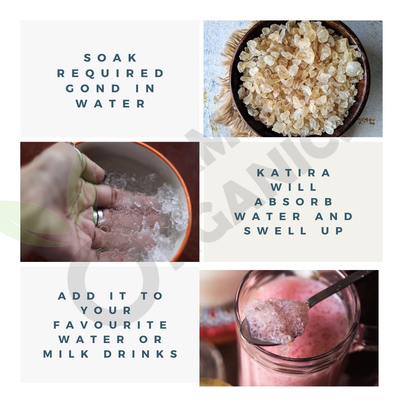 - It is commonly used as a base for condiments, dressings for salads, sauces and mayonnaise. Gond katira also works to thicken ice creams, to make pudding, laddoos and its even used for cake decorations.