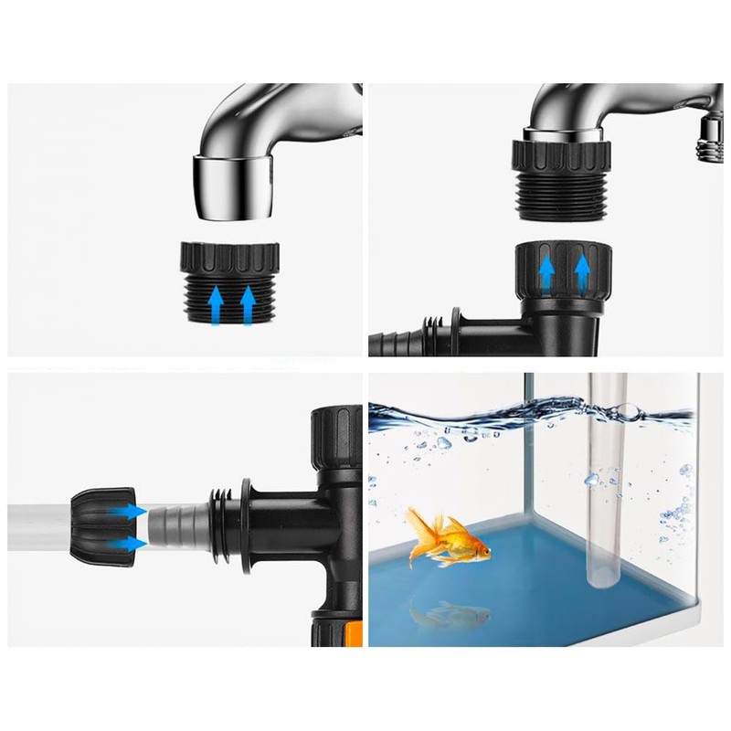 4. Utilizes the clean water pressure from the faucet to suction out waste and debris in the aquarium.