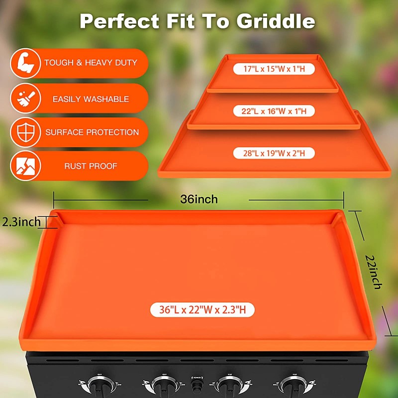 【Perfect Fit】: Our griddle mat is custom-designed to fit perfectly 36", 28"(Except 28" XL), 22", 17" griddle, without any trimming, ensuring that it won't wobble or slide, this silicone griddle mat can protect your griddle from rust when you use it on a clean, cool, lightly oiled surface.