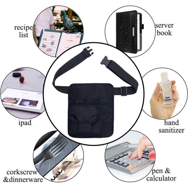 • Two ways to wear. Waitress/waiter waist bag can be carried in two ways around the waist or shoulder, as a removable shoulder strap and waist belt to switch according to different use scenarios. Adjustable length strap suits the needs of people with different lengths and body types.