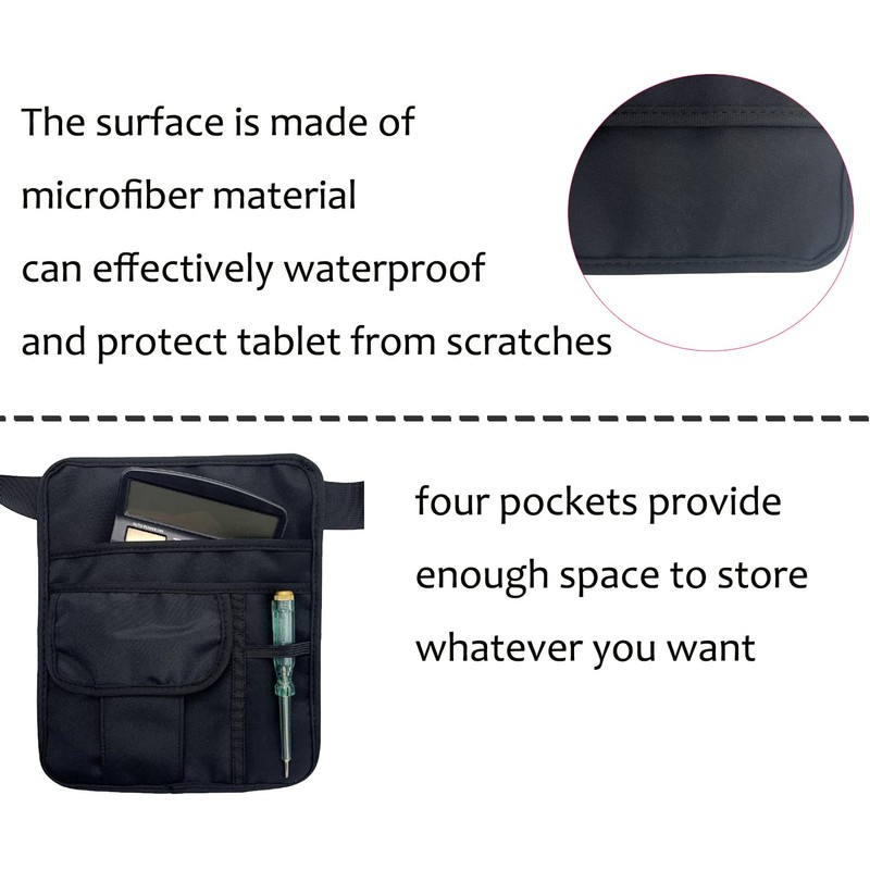• Safety and large storage space. The main pocket of the apron pouch made of microfiber to protect the iPad screen from scratching, and it has large room space for up to 10inch tablets.